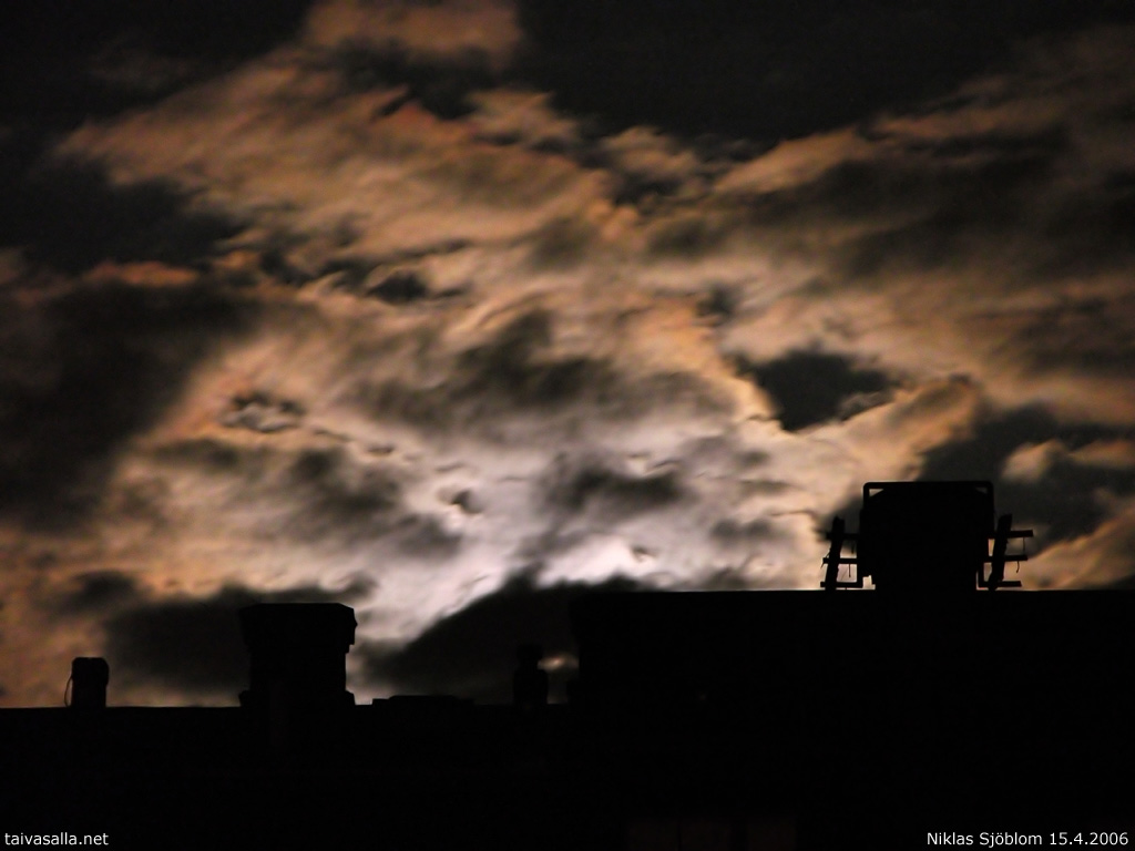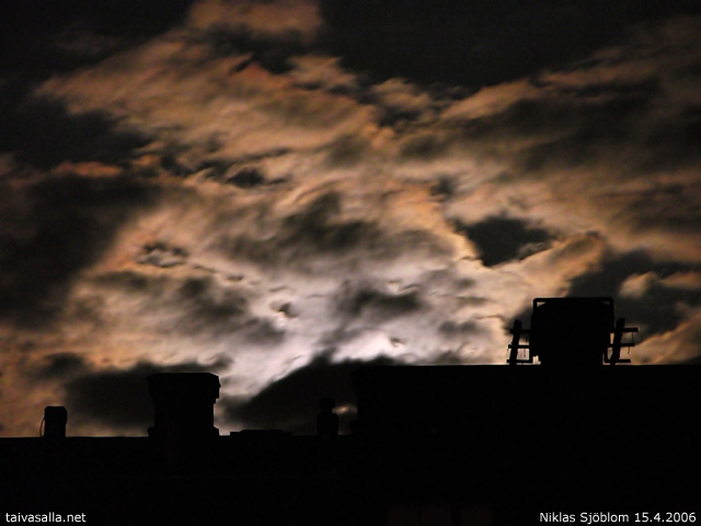 Todellisuudessa ilmiö ei näyttänyt erityisen uhkaavalta, mutta kiehtovalta kylläkin. Pilviä oli aika pienellä alueella, ja pian kuvan ottamisen jälkeen kuu mollottikin jo pilvettömällä taivaalla. Olin juuri menossa nukkumaan, kun katsoin ikkunasta ja päätin vielä vielä vähän valvoa. :)