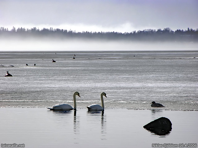 Helsinki: Kyhmyjoutsenpariskunta ja muita lintuja sulavalla Seurasaarenselällä usvan hälvetessä. Kuvattu Hietaniemen uimarannan pohjoispäästä kohti Lauttasaaren luoteiskärkeä.