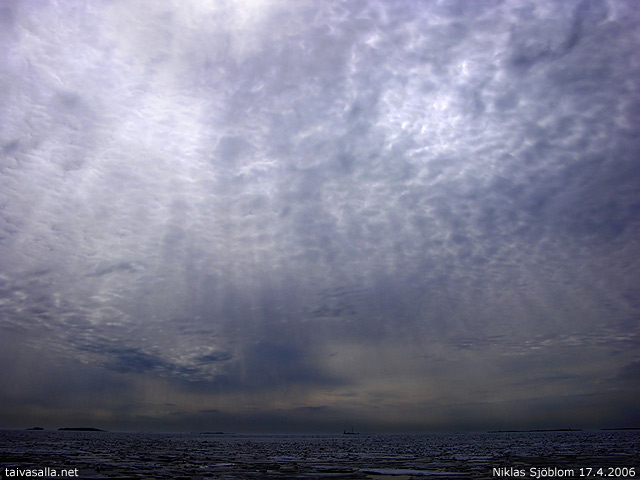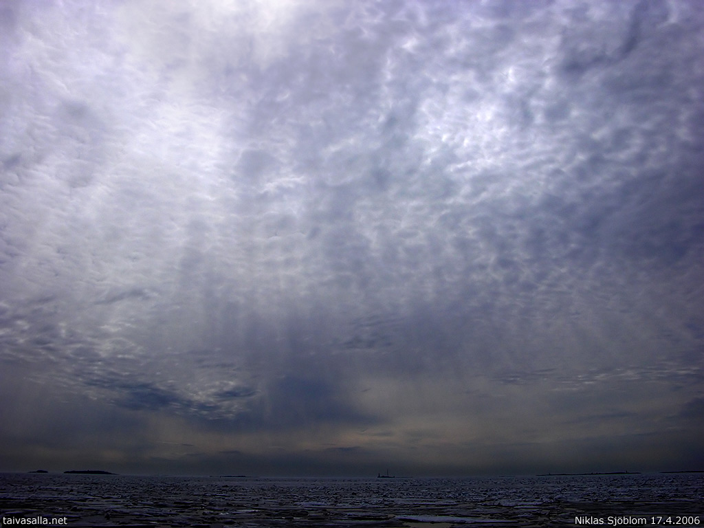 Helsinki: Kevätauringon valo siivilöityy pilvipeitteen läpi Suomenlahden yllä. Kuvattu Suomenlinnan Länsi-Mustasaaresta kohti horisontissa erottuvaa Harmajaa pari tuntia ennen sateen alkamista.