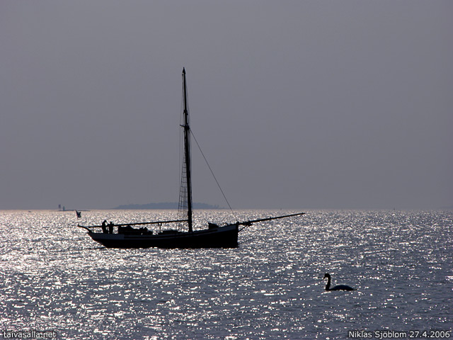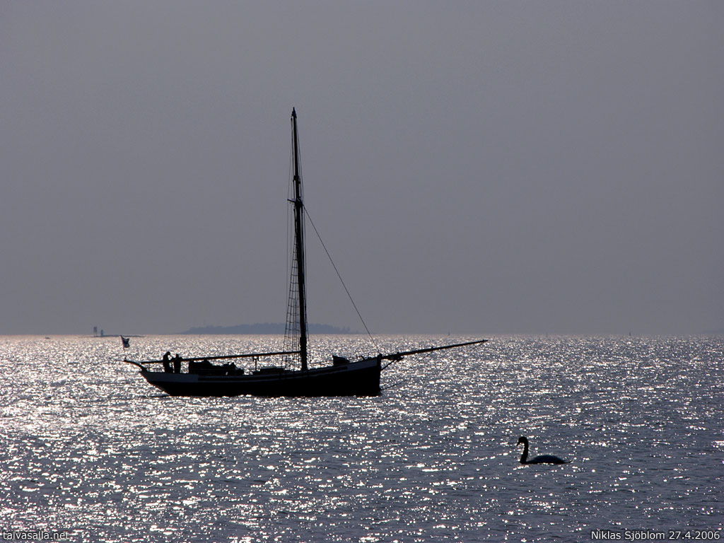 Helsinki: A sailing ship meets a mute swan on the sparkling Lauttasaarenselkä sea area. Picture taken from Länsi-Mustasaari, one of the Suomenlinna islands.