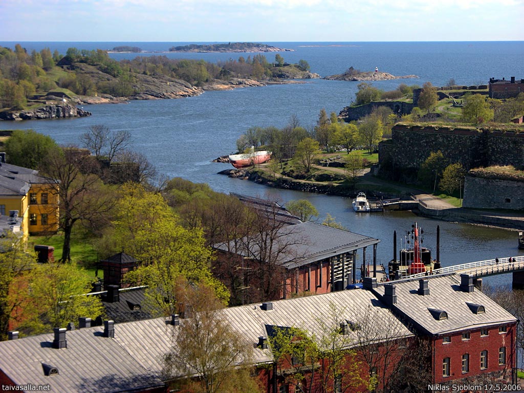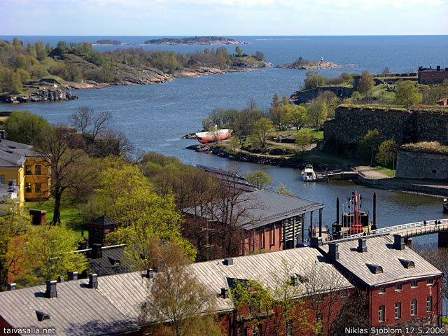 Helsinki: Keväinen näkymä eteläkaakkoon Suomenlinnan kirkon tornista Isosta Mustasaaresta. Tykistölahden takana Susisaari ja Kustaanmiekka, vasemmalla Kustaanmiekan salmi ja Vallisaari.