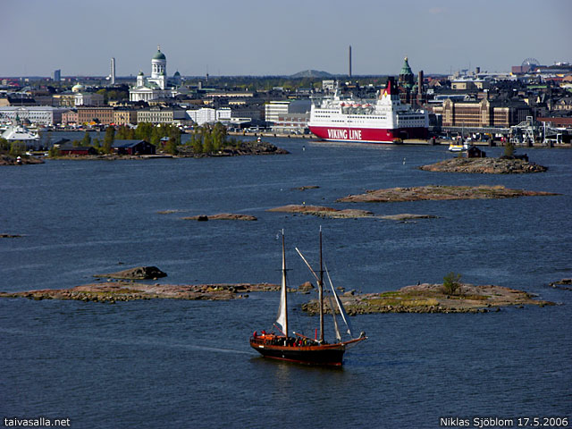 On muuten hauska miten maisema litistyy tässäkin kuvassa. Näyttää ihan siltä kuin rannassa olisi vain kapea rakennettu kaistale, jonka jälkeen olisi metsää Malminkartanoon saakka. Ilman purjelaivaa ja luotoja tässä kuvassa ei olisikaan juuri mitään syvyyttä tai katseltavaa.