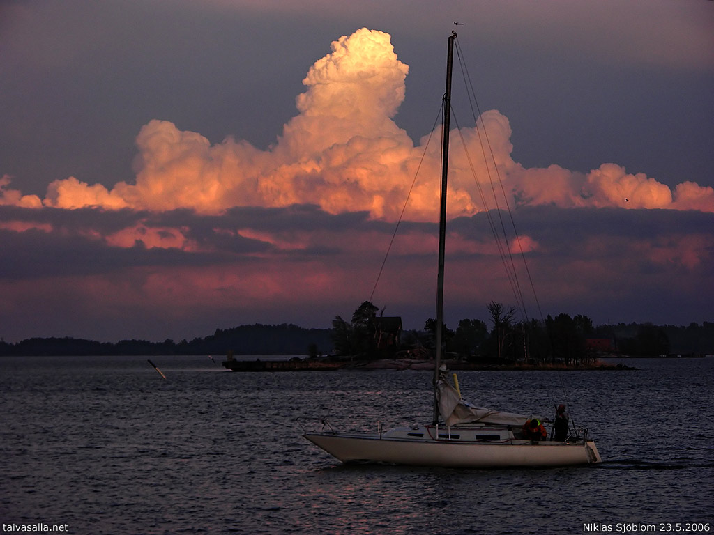 Helsinki: A rising thundercloud lit by the sunset dominates a view from the shore of Katajanokka district. Thundershowers formed above the Gulf of Finland were moving towards the coast.