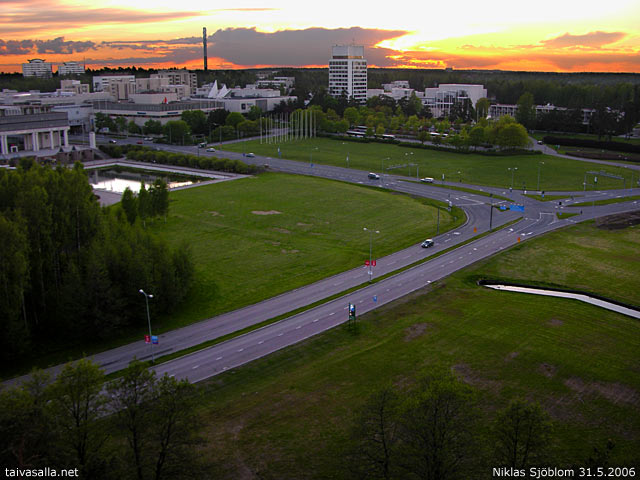 Espoo: Tapiolantie street, Merituulentie street and the centre of Tapiola district seen from the roof terrace of a residential building. The view is from Espoo, a neighbouring city of Helsinki.