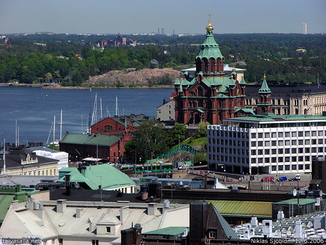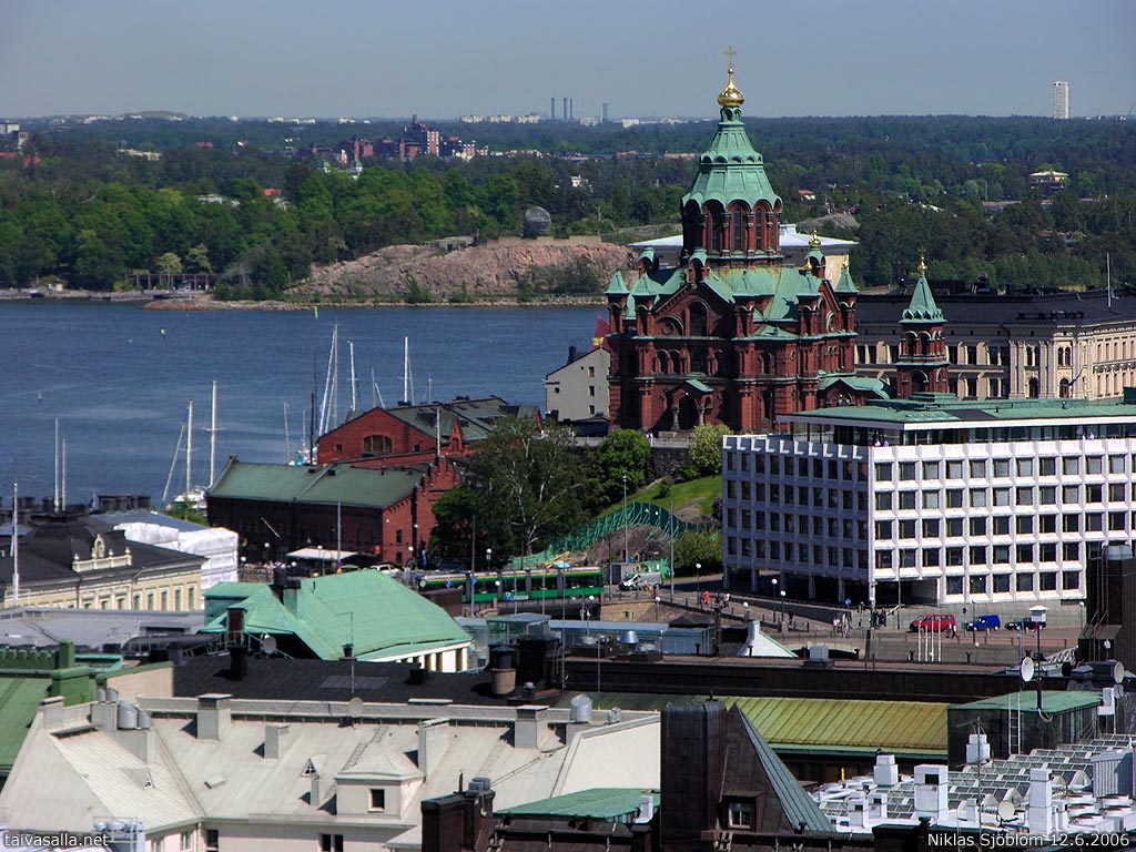 Helsinki: View towards Katajanokka district from the tower of Erottaja Rescue Station near the city centre. The cliff seen left of the Uspenski Cathedral belongs to the Korkeasaari Zoo island.