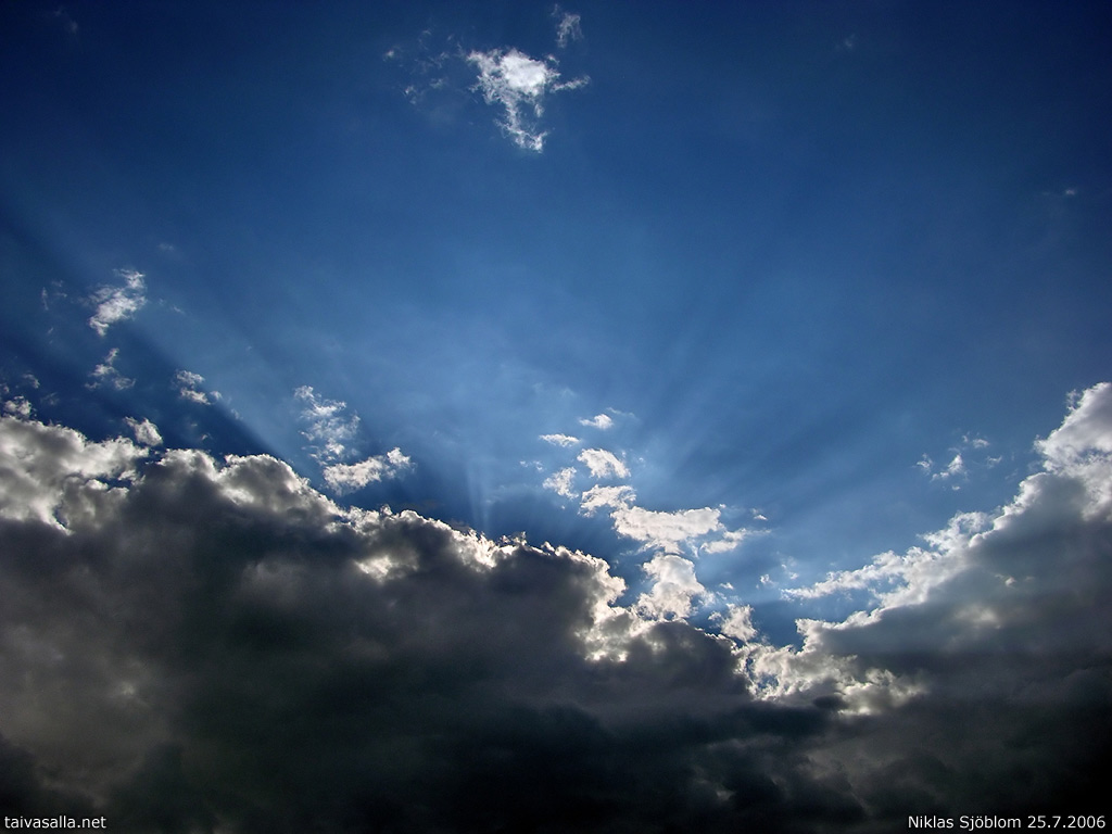 Hyvä taivaskuva. Kontrastit kohdallaan ja pilven takaa loistavat auringonsäteet luovat odotuksen tunnetta jostakin paremmasta. Aurinko paistaa meille jälleen...