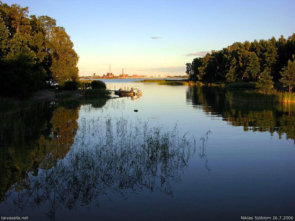 Helsinki: Lehtisaarensalmi strait seen from the bridge between Kuusisaari (left) and Lehtisaari (right) islands. In the background Seurasaarenselkä sea area and Salmisaari power station.
