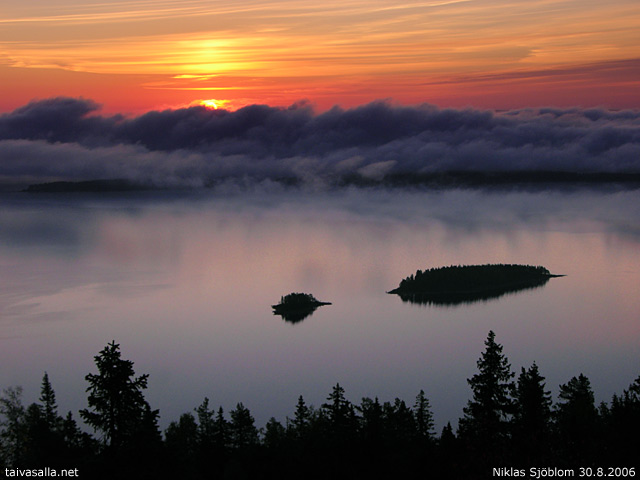 Lieksa: Aamusumu valtaa Kolin, osa 1. Auringonnousun aikaan Ukko-Kolin läheisyydestä otetussa kuvassa näkyy Pielisen yllä leijuva sumurintama, joka lähestyy Pieni-Hölön ja Iso-Hölön saaria.