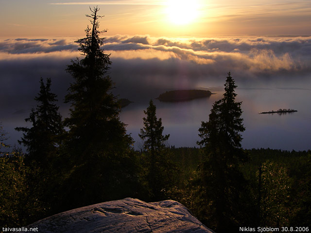 Lieksa: Aamusumu valtaa Kolin, osa 3. Lähestyvä sumurintama Pielisen yllä sävyttää Suomen kansallismaisemaa. Kuvattu Ukko-Kolilta Kolin kansallispuistosta pian auringonnousun jälkeen.