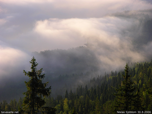Lieksa: Aamusumu valtaa Kolin, osa 8. Sumupilvet vyöryvät Pieliseltä Kolin metsäisille rinteille ja nousevat edelleen yhä korkeammalle. Kaakkoisnäkymä Ukko-Kolilta Kolin kansallispuistosta.