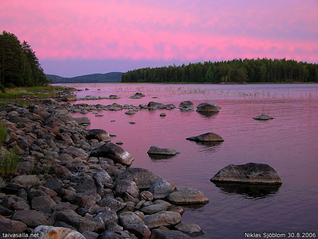 Lieksa: Purppurainen kaakkoisnäkymä Pielisen Hattuselän rannalta, Hattusaaren länsipuolelta. Kuvattu illalla pian auringonlaskun jälkeen, jolloin aurinko paistoi enää pilvien korkeudella.