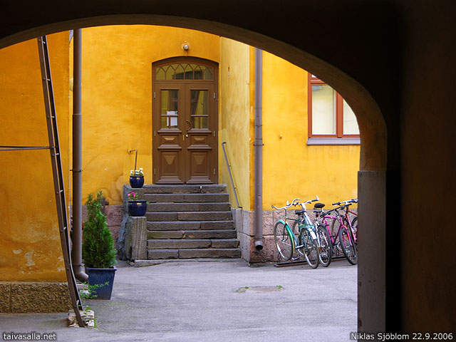 Helsinki: Näkymä Kasarmikatu 4:n porttikäytävästä rakennuksen sisäpihalle Ullanlinnassa. (Lisätietoja talosta: korttelit.fi.)