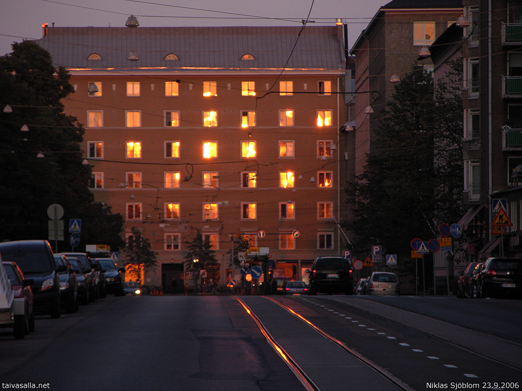 Helsinki: Western evening sunshine glowing in the windows of a residential building on Kaarlenkatu street in Kallio district. Picture taken along Helsinginkatu street.