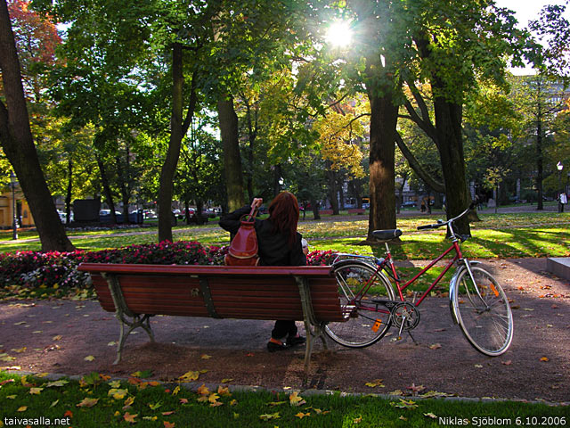 Ihanan tunnelmallinen kuva tutusta puistosta. Miten on tyttö osannutkaan valita repun, sukat ja polkupyörän penkin värin mukaan!