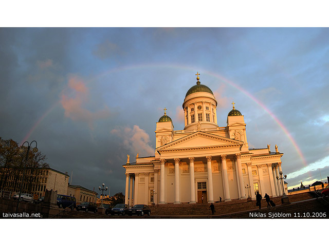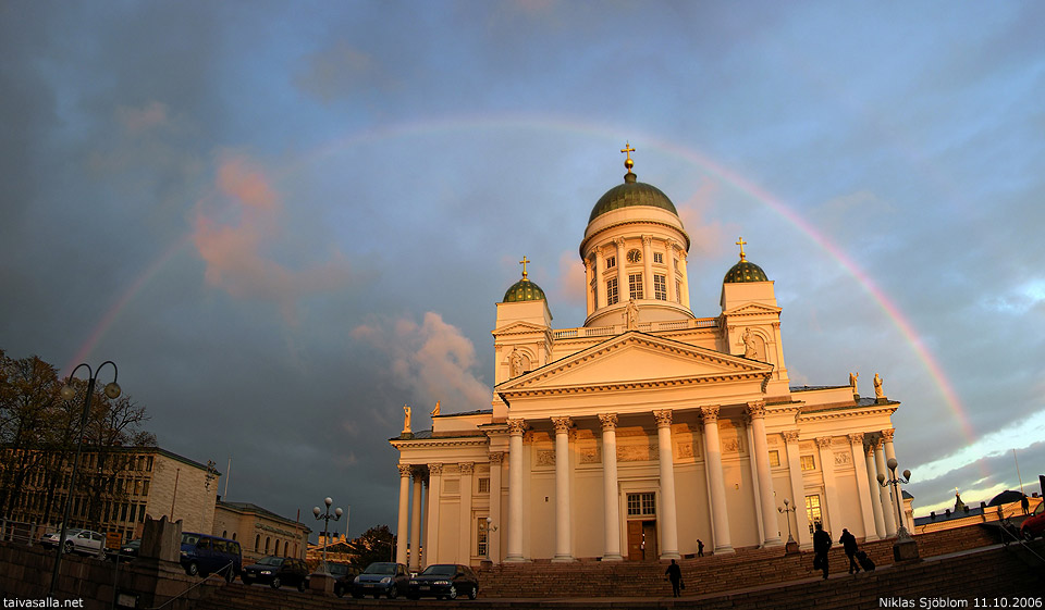Helsinki: Tuomiokirkko ja itäisellä iltataivaalla loistava sateenkaari kuvattuina Kansalliskirjaston portailta Unioninkadulta. Katso kolmesta pystykuvasta koottu panoraama myös suurempana.