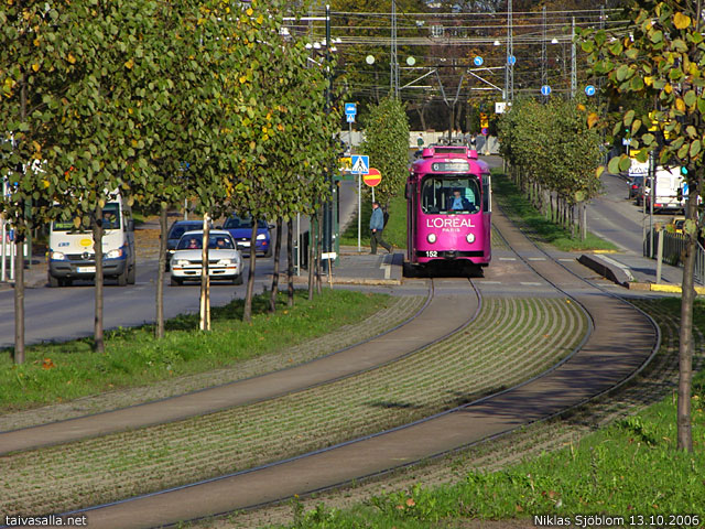 Näyttääpä vielä yllättävän kesäiseltä. Muutama ruskottunut lehti näkyvissä, mutta muuten tulee ihan lämmin fiilis. Ratikan väri on myös piristävä tekijä kuvassa.