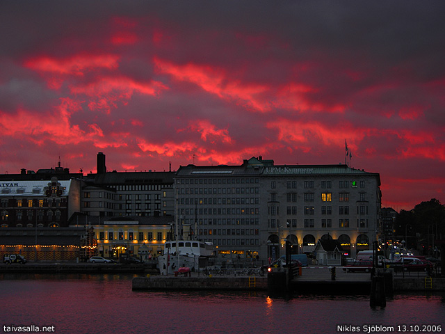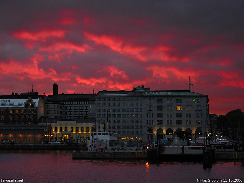 Helsinki: Syysillan auringonlasku sai pilvet kaupungin yllä hehkumaan kuin tulessa. Katajanokalta otetussa kuvassa näkyy mm. Etelärannan rakennuksia, Lyypekinlaituri ja Kauppatorin rantaa.