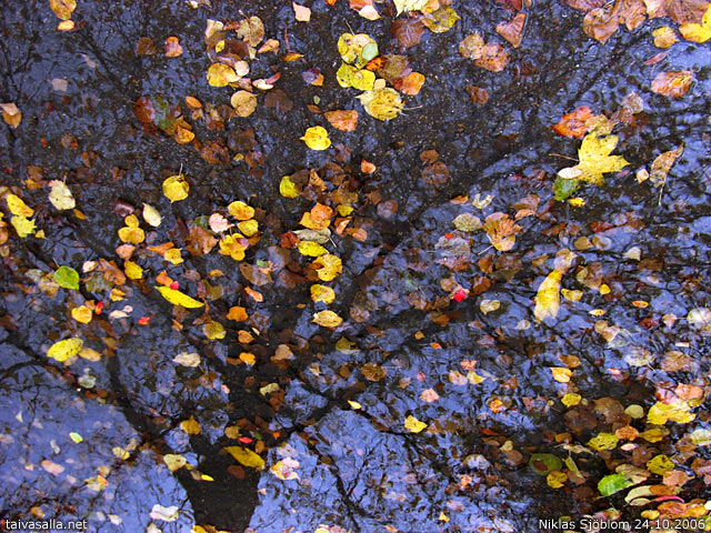 Kävelin Eläintarhanlahden ja junaradan välissä olevaa kävely-/pyörätietä ravintola Kaisaniemen lähellä, kun katseeni osui tähän puoliksi asfaltilla ja puoliksi hiekalla olevaan vesilätäkköön. Lätäkön pyydystämät lehdet ja sen pinnasta heijastuva puu herättivät heti mielenkiintoni, mutta koska edeltävänä päivänä oli satanut runsaasti ja lätäköitä piisasi, oletin löytäväni paremman kuvauskohteen jostain muualta. Olin ohittanut lätäkön jo kauan sitten, kun päätin kääntyä takaisin kuvaamaan sen, koska en muuten saanut rauhaa. Vastaus Paulan esittämään kysymykseen on siis että ensin löysin ja sitten keksin.