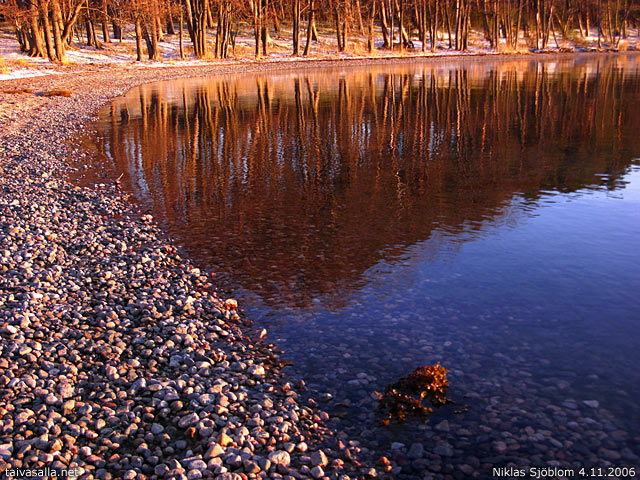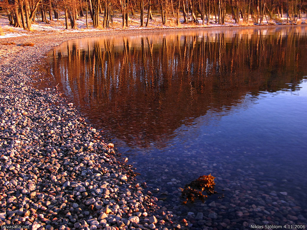 Tässä yhdistyvät luonnon monet kauniit elementit. Vesi on kaunis, kuvajainen siinä myös. Puun rungot. Ja vielä sitten nuo kivet!! Kauniita pyöreitä kiviä noin paljon ihailtavana ja tuossa valossa!