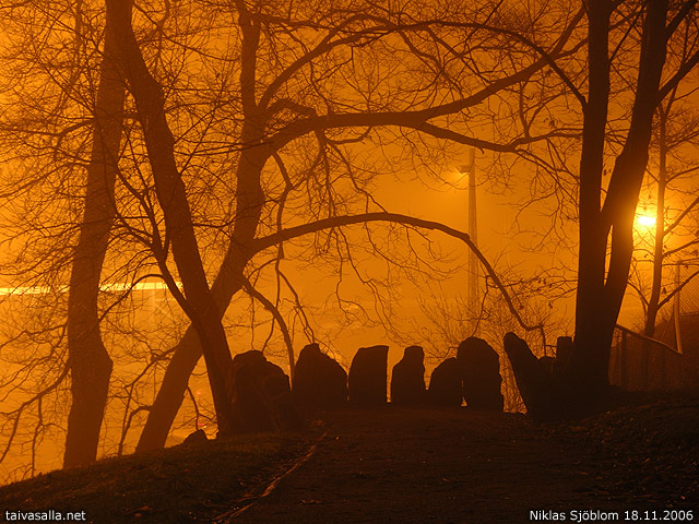 Helsinki: A small "Stonehenge" situated on the foggy Tähtitorninmäki (Observatory Tower Hill) in the district of Ullanlinna.