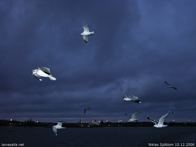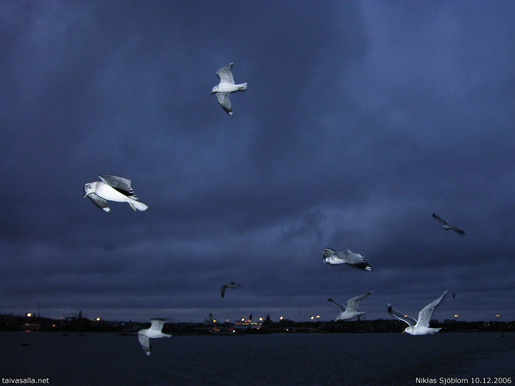 Helsinki: Suomenlinnan lautan perässä lentäviä lokkeja kameran salamavalon loisteessa. Pimenevän Kruunuvuorenselän takana näkyy Eteläsataman valoja ja kaupungin siluettia.