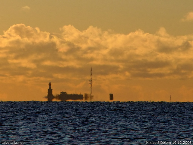 Helsinki: Harmajan majakkasaaren kangastus lämpimän meren ja kylmän ilman rajapinnassa. Eteläisestä Uunisaaresta otettua kuvaa on rajattu reilusti, mikä on syönyt sen tarkkuutta.