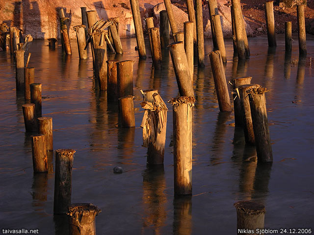 Kotka: Lammikkoon juntattuja paaluja Katariinanniemen uudessa puistossa Katariinassa.