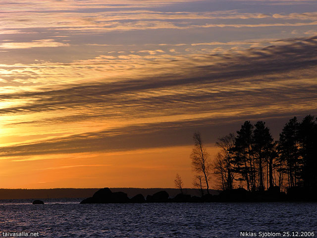 Kotka: Pyhtään rajan tuntumassa sijaitsevan Sammalsaaren eteläkärki laskevan auringon värjäämässä maisemassa. Kuvattu Santalahden luontopolun varrelta Mussalosta.