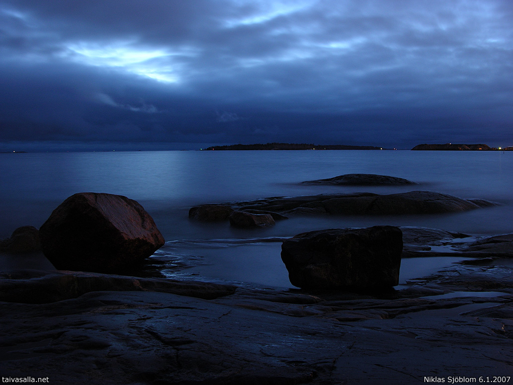 Helsinki: Sininen näkymä Ullanlinnan edustalla sijaitsevan Liuskasaaren läntiseltä rannalta. Kuvattu iltahämärissä puolen minuutin valotusajalla.