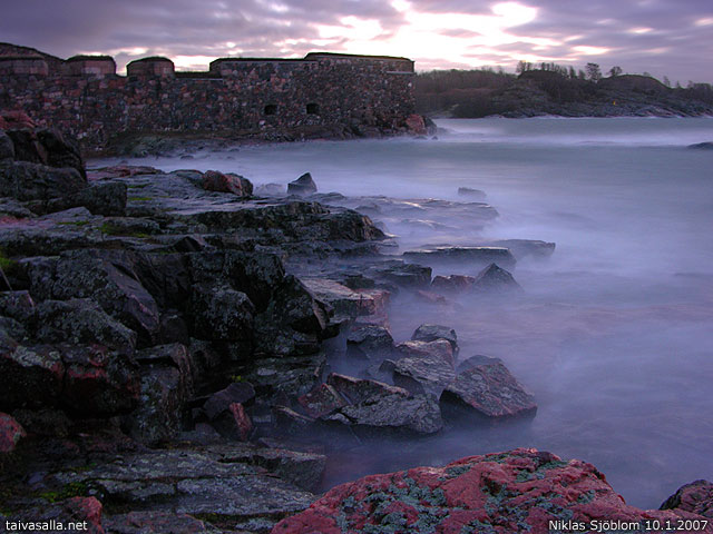 Helsinki: Kustaanmiekan etelärantaa Suomenlinnassa myrskyisänä aamuna. Vallisaari näkyy takaoikealla, Kustaanmiekan salmen toisella puolella. Kuvattu puolen minuutin valotusajalla.