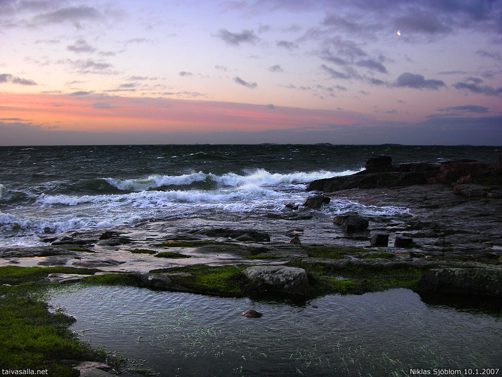 Vihdoinkin kunnon tyrskyt. Ja vielä kuu ja aamurusko kaupan päälle. Kiitos.