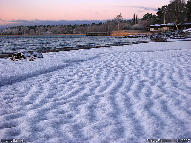 Näköjään joskus on hyväkin asia, ettei lunta ole paljon - laineethan eivät paksun hangen alta näkyisi. Taustan lumiset puut ja punertava iltataivas antavat kivan lisämausteen. Oikein hieno kuva siis :)