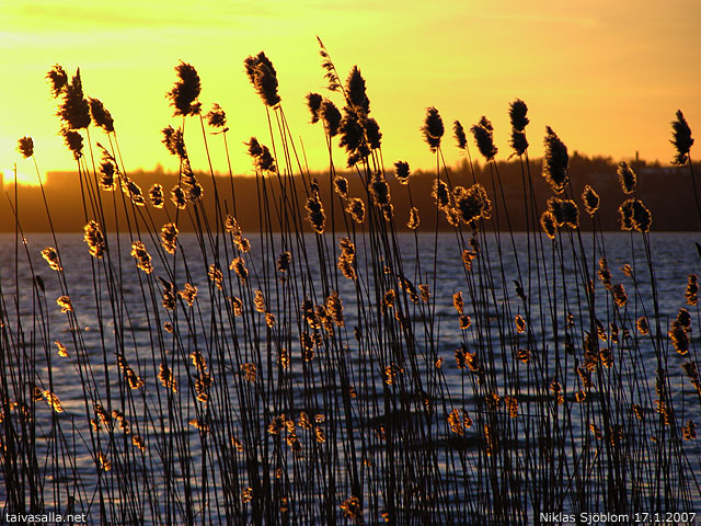Kuvatessani jätin auringon juuri ja juuri kuvan vasemman reunan ulkopuolelle. Otin tarkoituksella kohteeksi kaukana rannasta olevia kaisloja, joten aurinko paistoi kaikkiin kuvan "tupsuihin" melko suoraan vastakkaisesta suunnasta, mikä on syy niiden loistoon.