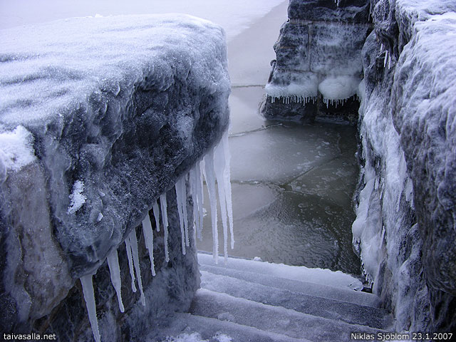 Helsinki: Jäiset portaat Ehrenströmintien rantamuurissa Kaivopuistossa.