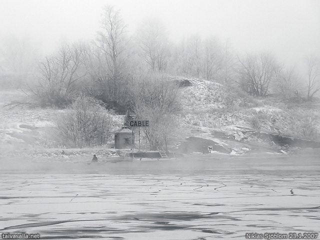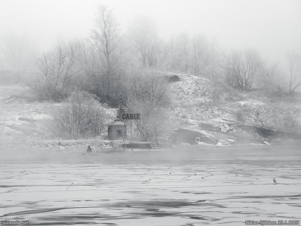 Voi miten kaunis huurrekuva tämä on, en minäkään ensin huomannut soutajaa, mutta silmiin pisti koiran ulkoiluttamiskielto ja cable-tekstit.