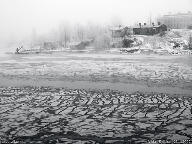 Helsinki: Harakan saari kuvattuna Kaivopuistonrannasta kylmänä ja sumuisena talviaamuna.