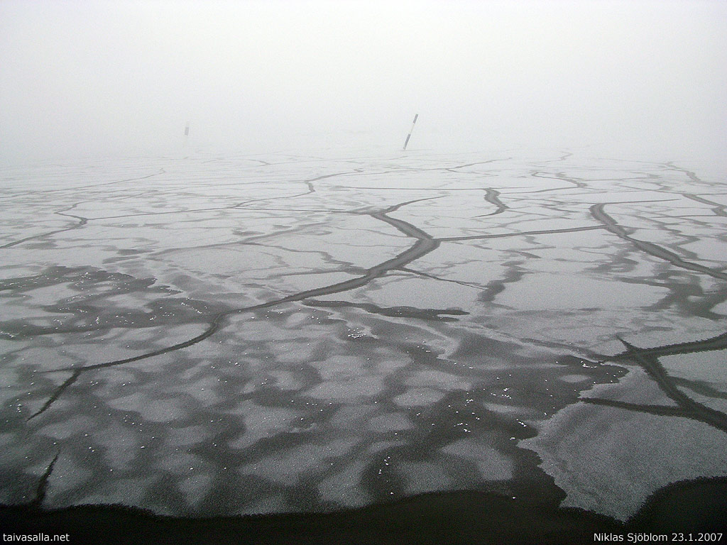 Helsinki: Näkymä sumuiselle Kruunuvuorenselälle Ehrenströmintien varrelta Kaivopuistosta.