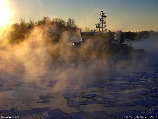Helsinki: Rajavartiolaitoksen vartiolaiva Merikarhu pakkashöyryisessä Kustaanmiekan salmessa Suomenlinnan ja Vallisaaren välissä. Alus lienee suunnannut kotisatamaansa Katajanokalle.