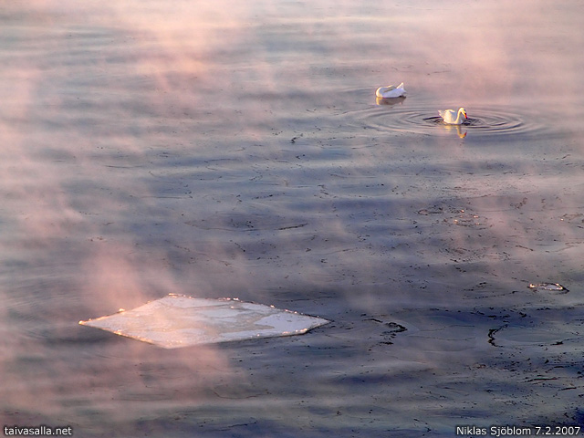 Helsinki: Aamuauringon valoon heräilevä kyhmyjoutsenpariskunta Kustaanmiekan edustalla Suomenlinnan eteläpuolella. Jäätyvä meri höyrysi parinkymmenen asteen pakkasessa.