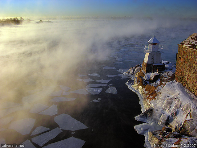 Helsinki: Merivesi höyryää kylmänä aamuna Kustaanmiekan salmessa Suomenlinnan itäpuolella. Oikealla näkyy Kustaanmiekan eteläkärjen rantavarustusta ja takana vasemmalla Vallisaarta.