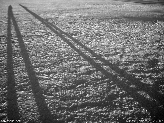 Ei, vaan kaksi kulkijaa laskevan auringon valossa Onkimaanjärvellä Lopella.