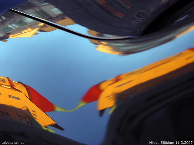 Helsinki: Residential buildings on Kauppiaankatu street in the district of Katajanokka reflected in a parked car. The buildings seen are Lilla Olofsborg, Olofsborg, Suomela and Kataja.