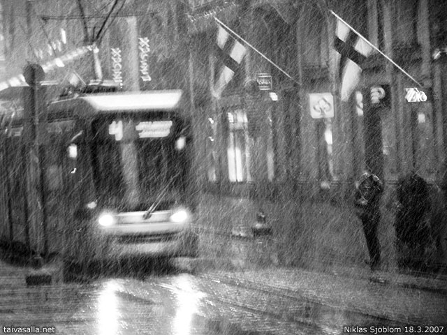 Helsinki: A tram in dense snowfall on Aleksanterinkatu street in the city centre.