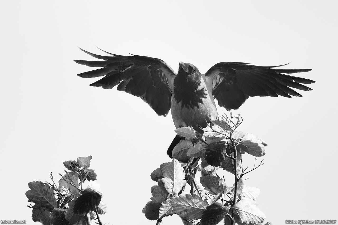 Helsinki: Varis kuivattelee siipiään merenrannalla kasvavassa puussa Ursinin kalliolla Eirassa.