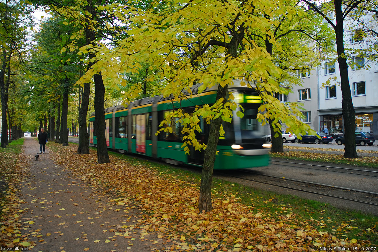 Helsinki: Neloslinjan raitiovaunu syksyn sävyttämällä Munkkiniemen puistotiellä.