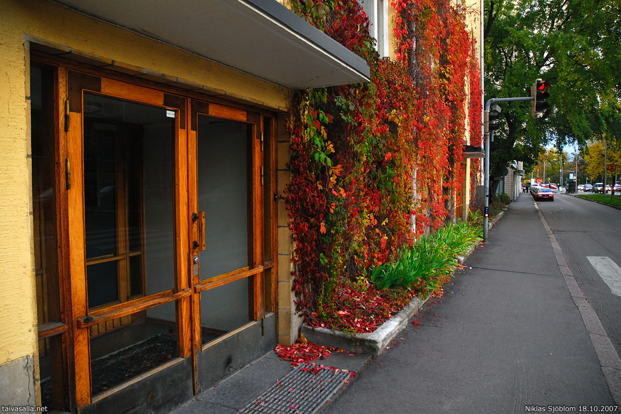 Helsinki: Syksyn väriloistoa Huopalahdentie 5:n seinällä Munkkiniemessä.