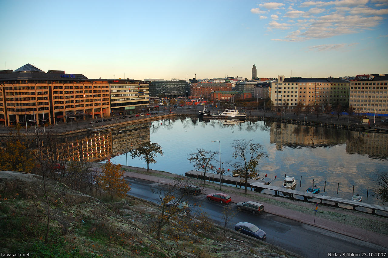 Helsinki: Näkymä Siltavuorensalmen yli kohti Hakaniemen toria, Siltasaarta ja Kalliota. Kuva on otettu lähes tyynenä syysaamuna Siltavuorelta, eli Siltavuorenrannan ylle kohoavalta kalliolta Kruununhaasta.