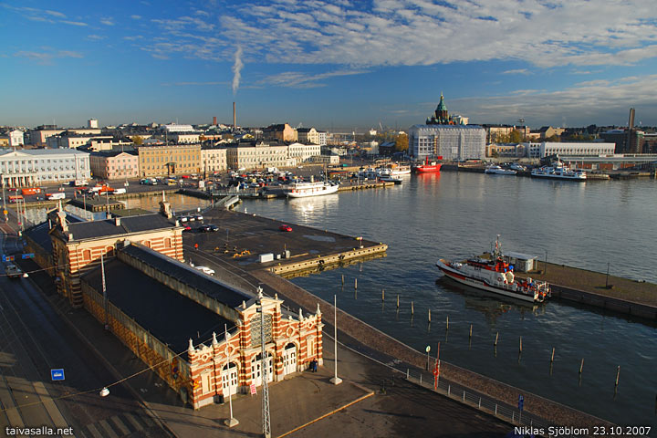 Helsinki: Syysaamun näkymä hotelli Palacen parvekkeelta Etelärannasta kohti Kauppatoria, Kruununhakaa ja Katajanokkaa.