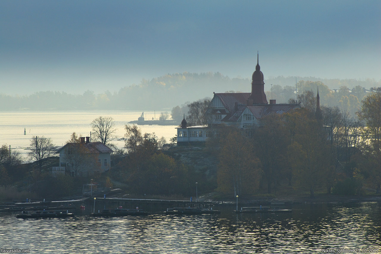 Helsinki: Eteläsataman edustalla sijaitseva Luoto ja ravintola Klippan utuisena syysaamuna. Taustalla näkyvät Suomenlinnan Iso Mustasaari ja Kuninkaansaari. Kuva on otettu hotelli Palacen parvekkeelta Etelärannasta.