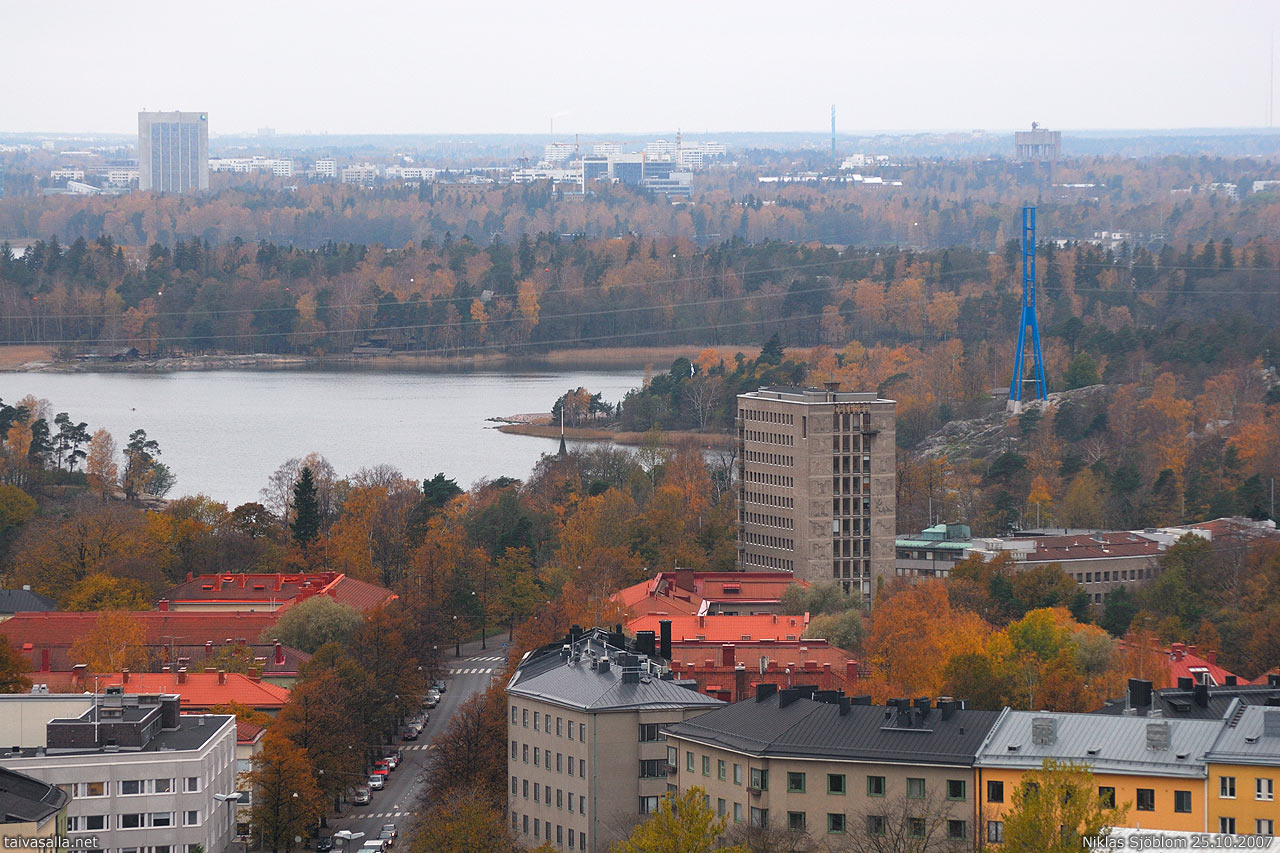 Helsinki: Syksyinen näkymä Olympiastadionin tornista kohti Meilahtea, Seurasaarta ja Espoota. Länteen avautuvan maiseman alaosassa näkyy Taka-Töölössä sijaitseva Linnankoskenkatu. Keltaiset talot alaoikealla ovat Nordenskiöldinkadun varrella.